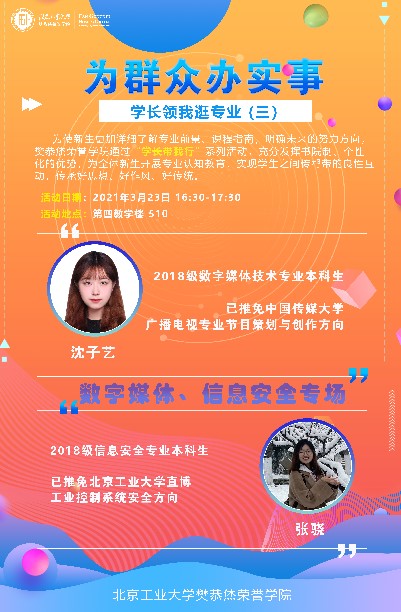 邀请了2018级数字媒体技术专业沈子艺和2018级信息安全专业张骁两位学姐,2021级全体新生和辅导员戴璐老师参与了本次活动,班主任助理陈宇卿主持。