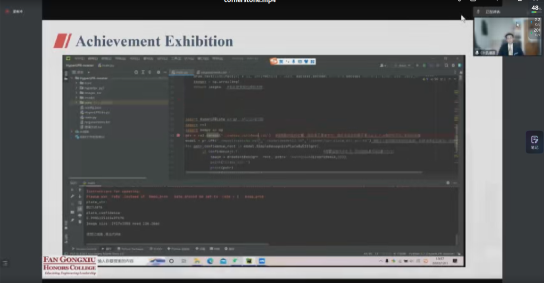 特色的Stone计划继续发光发热。随后项目汇报按照2021级Cornerstone(12组)和2020级Keystone(8组)顺序依次进行,汇报包括成果展示和评委提问两个环节。汇报内容覆盖电子科学,信息安全,人工智能、材料制造等多个学科,各专家老师对每个组进行了点评和指导,各组汇报人也与专家进行了充分的思维碰撞和交流。