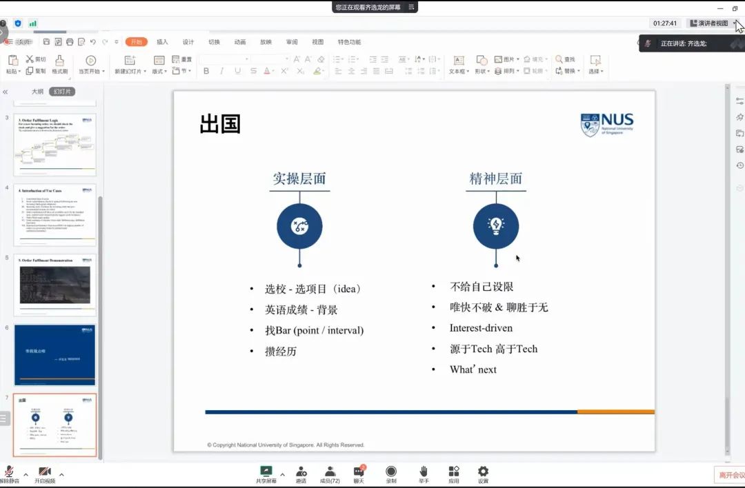 作为毕业后选择出国读研的优秀学长,齐选龙学长重点对有出国留学想法的同学提出了寒假规划建议。在实操方面,他建议同学们在寒假多积攒经历来丰富简历,并在选择目标院校和研究项目上提出了切实可行的建议。在心态方面,他鼓励同学不要给自己设限,要根据兴趣,敢于尝试,科学规划,多想what’s next。