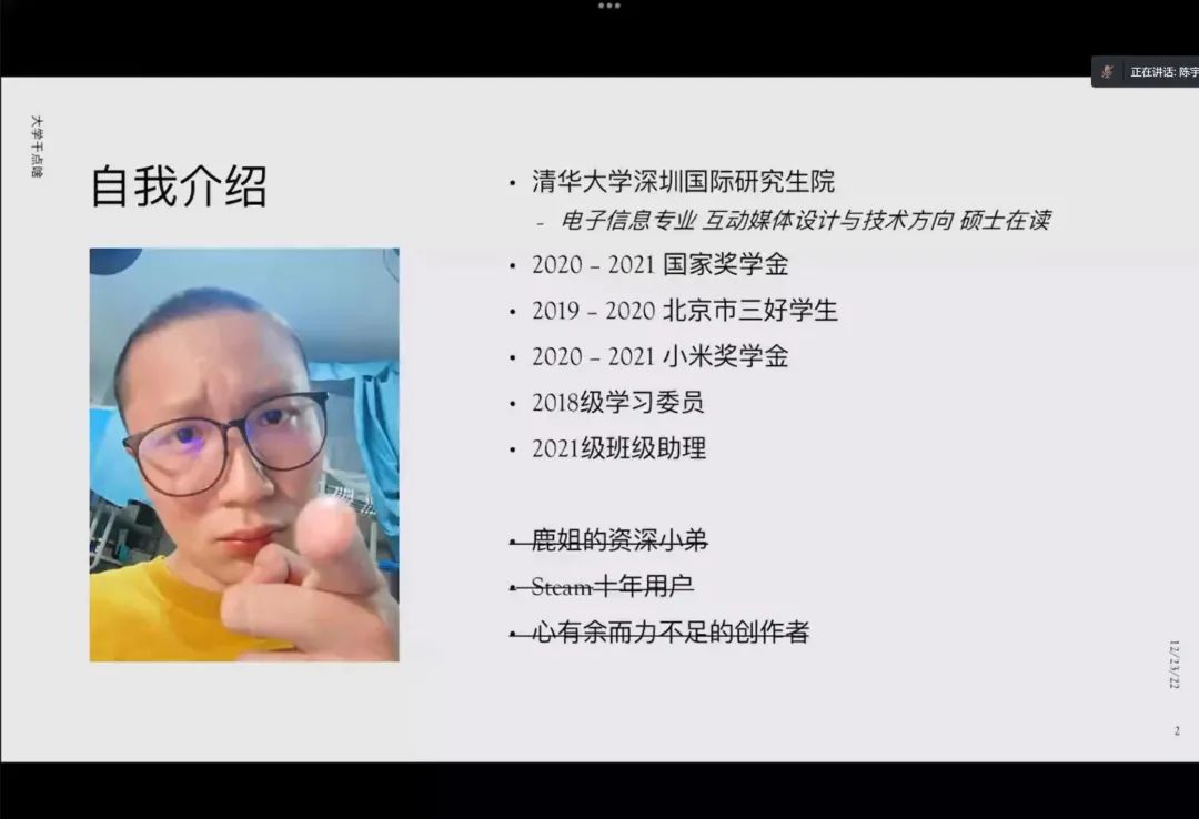相比于寒假的规划,陈宇卿学长将重点放在了大学干点啥,分别从大一到大四,针对于不同年级的特点提出了宝贵的规划建议。大一要认识自己的长处和喜好;大二要认识专业;大三要抓住机会,丰富简历,看淡得失;大四则要珍惜大学时光,可以培养自己专业之外的兴趣。最后他希望同学们都能好好学习,不要挂科,放下焦虑,好好过年。