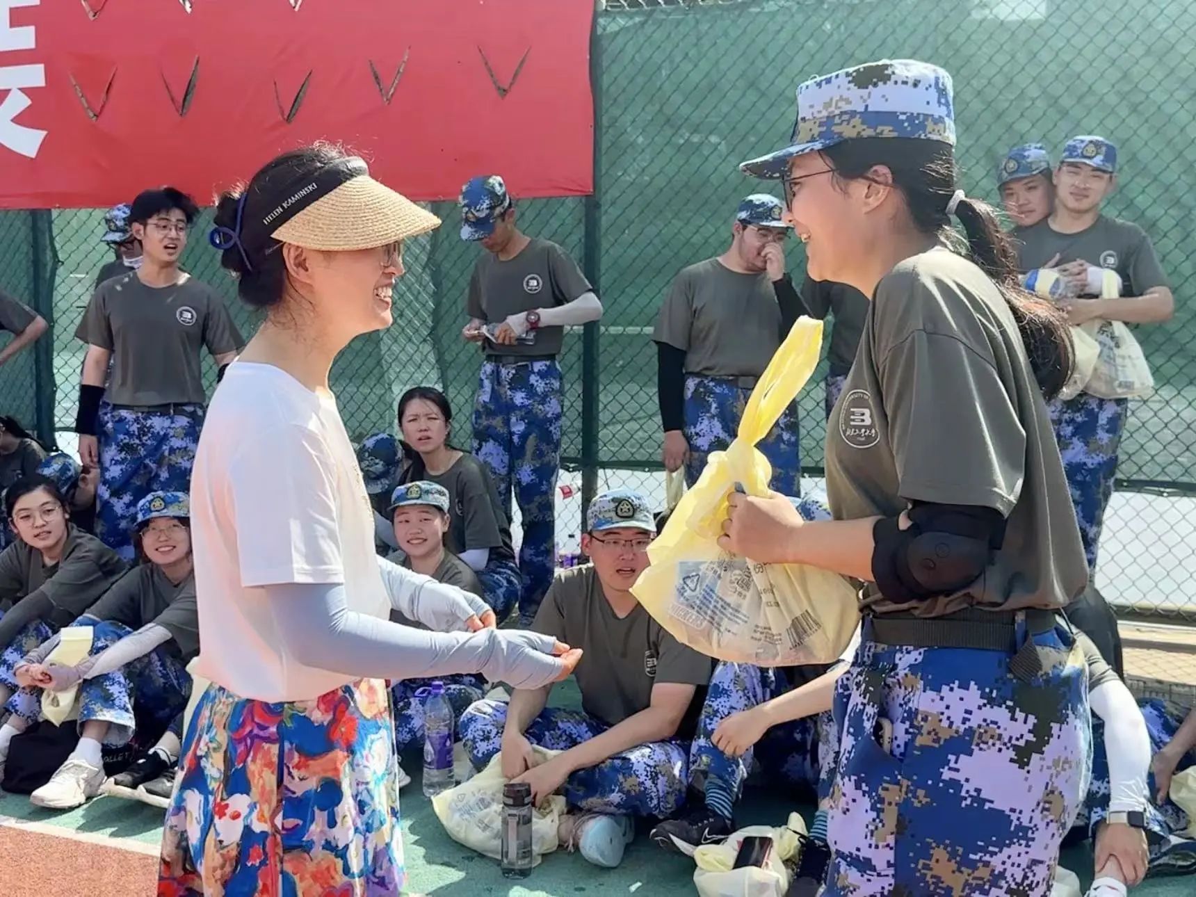 屡屡为同学们送来消暑物资,副院长袁莉敏老师亲切地慰问了同学们,她对同学们昂扬的士气表示高度赞许,叮嘱同学们在当前高温的不利条件下做好防暑措施,注意休息和补水,鼓励同学们继续发扬不怕苦不怕累的精神,以饱满的精神状态完成后续的训练任务。指导员戴璐老师每日与同学们共同操练,做好后勤保障工作,为同学们及时补充“能量”,助力同学们在酷暑中舒畅满怀,为同学们的训练日程保驾护航。关怀的话语与举动使得同学们暂时忘记了汗流浃背的疲惫,收获了“能量加油站”的满满喜悦。