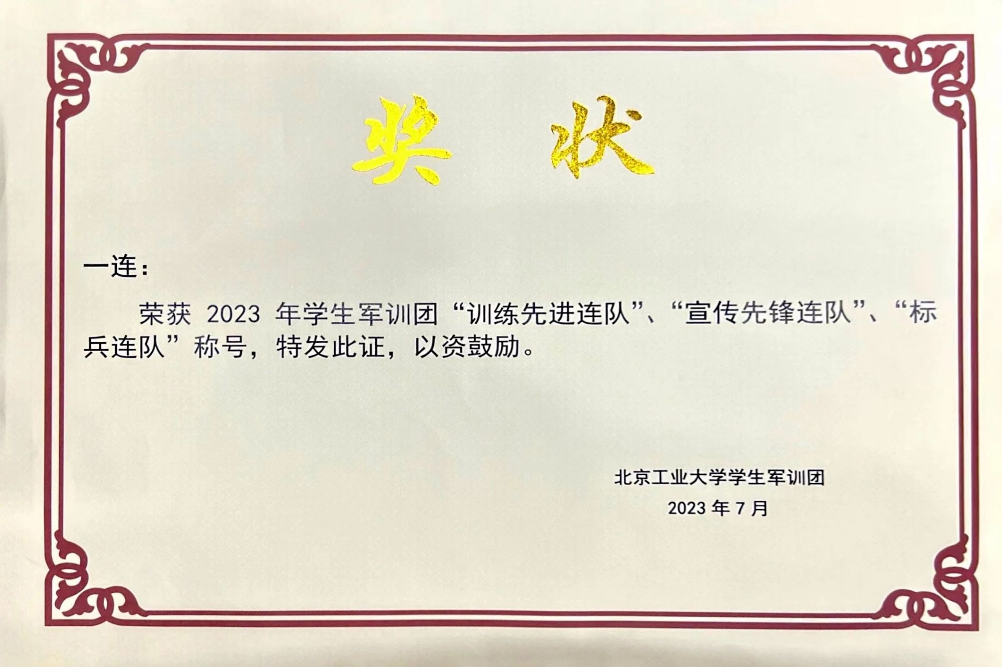 作为军训学员,42名同学被编为一连五班,形成了人数最少的方阵之一,在烈日开道的高温天气里,随着教官的精心组织和耐心训练,同学们训练了齐步走、正步走等基础性队列动作,并接受了军事射击训练、安全教育训练等。最终,经过十天的训练,同学们心往一处想,劲往一处使,反复的踩点排练追求分列式的极致,圆满完成了军训的成果展示,所在连队获得了“训练先进连队”称号、“宣传先锋连队”称号、“标兵连队”称号。