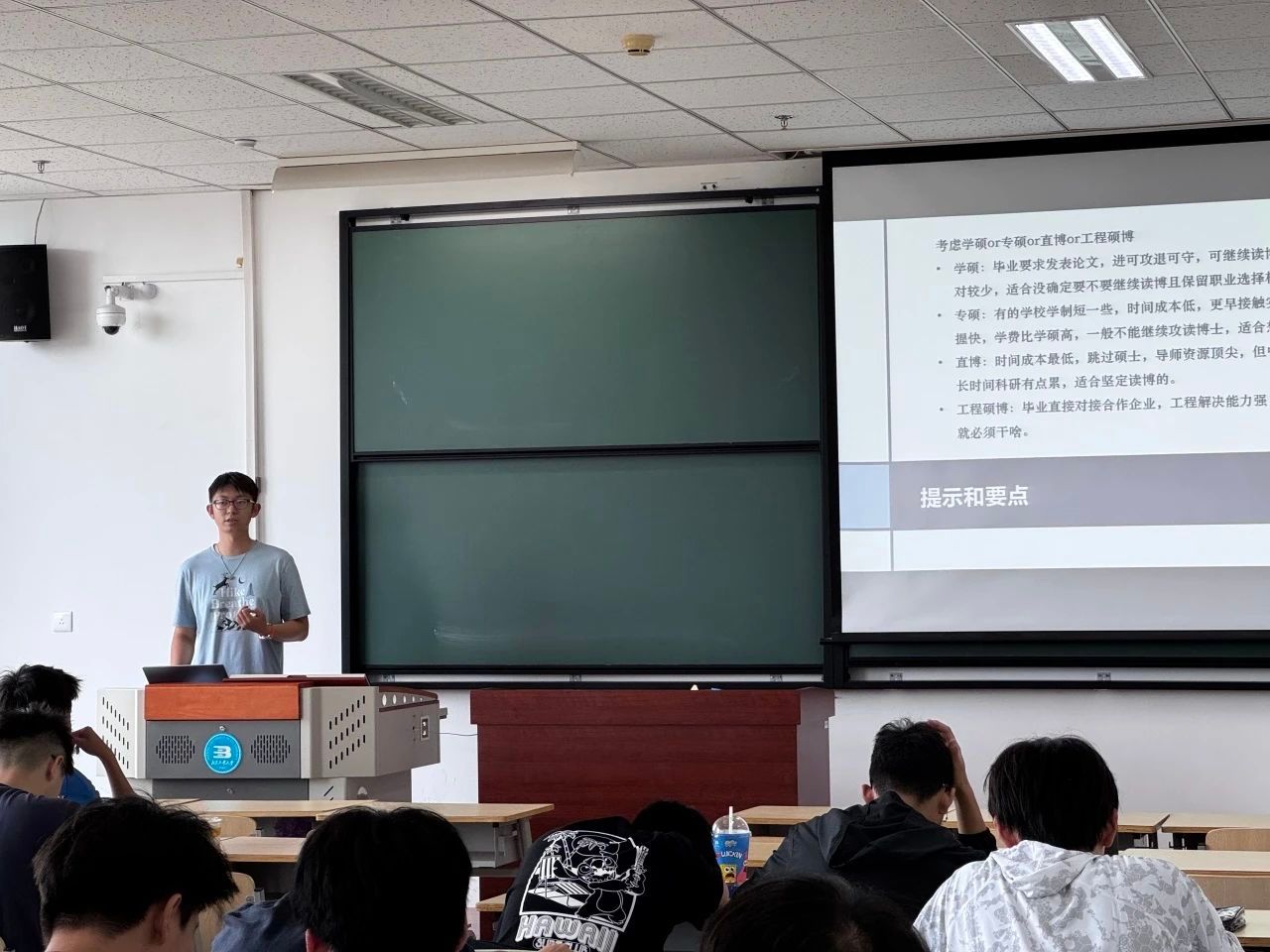 殷墨涵学长结合自己的经历,回顾了自己在科研探索中的曲折与收获,并着重讲解了如何申请国外学校,拿到目标院校的offer。从最初的迷茫到逐步明确方向,他用真实经历告诉学弟学妹们:成长是一场自我探索的旅程,要在尝试中不断寻找适合自己的路。他鼓励大家敢于迈出第一步,在过程中积累、沉淀。