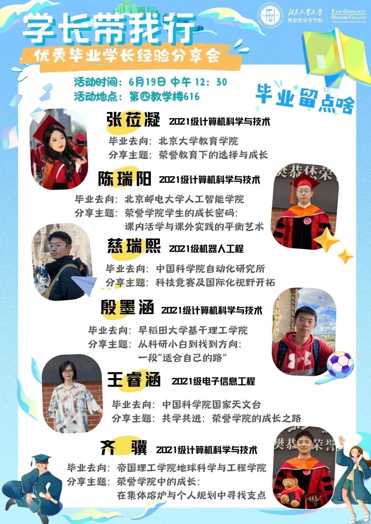 六位毕业学长学姐围绕学业探索、科研实践、竞赛经历、出国留学与人生选择等方面,结合自身成长历程,带来了真挚而深刻的分享: