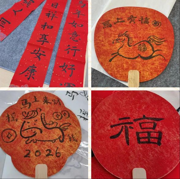 讲解过后,便是沉浸式的体验和实践。范教授现场铺展宣纸,亲身示范福字的运笔之法与间架结构,其笔下的福字,或笔力苍劲、沉稳大气,或笔墨灵动、洒脱舒展,福气意蕴随腕间流转,凝于笔尖。在范教授的悉心鼓励与指导下,同学们凝神执笔,从基础笔画临摹入手,大胆落笔、潜心创作,在喜庆的大红宣纸之上挥毫书写吉祥福字。素扇之上,落笔生姿,骏马的灵动意象藏于笔韵间,寄寓着新年顺遂前行、马到成功的美好祈愿。墨香袅袅,满是浓郁的新春意趣。笔下福字各展巧思,不少同学将绘画的灵动画意融入笔墨之中,勾勒出独具创意的艺术福字,尽显心意;素扇之上,落笔生姿,骏马的灵动意象藏于笔韵间,寄寓着新年顺遂前行、马到成功的美好祈愿。墨香袅袅,满是浓郁的新春意趣。